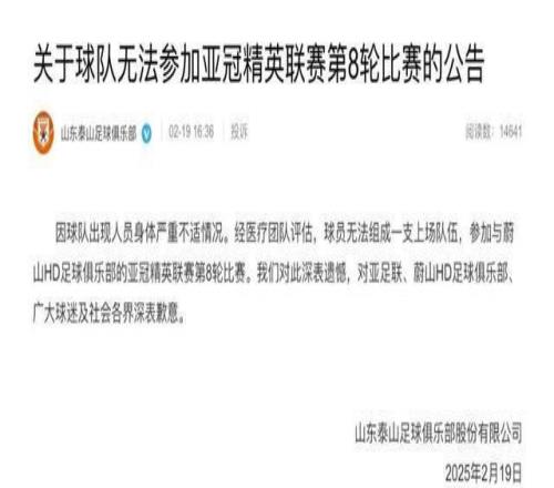 山东泰山因综合原因退赛。